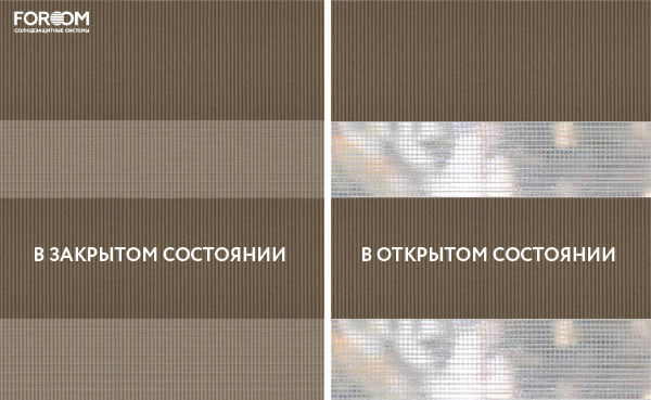 Каждый слой ткани имеет чередующиеся непрозрачные и прозрачные полосы. При смещении полос друг относительно друга можно добиться полного затемнения («ночь», когда непрозрачные полосы совпадают), максимального светопропускания («день», когда совпадают прозрачные полосы) или промежуточных режимов, создавая эффект «зебра».